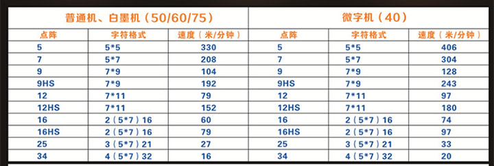 打印延時,自動重復,自動顛倒/翻轉,打印計數,用戶時鐘格式,可調整字符高度和寬度,往返噴印序列號打印、翻轉、顛倒、加粗字符、信息重復,條形碼,二維碼打印,計數器一鍵復位開關標準速度和高速選擇,三套字庫供選擇、拼音輸入可變數據噴印(包括條形碼、二維碼等)連接電腦噴印等。